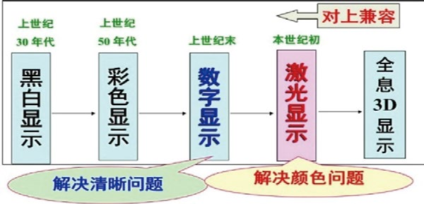 显示是将信息显示给人眼观看的人机界面终端,,,集观赏 / 娱乐应用和信息应用于一身,,其发展方向是超高分辨(几何 / 颜色双高清)、、全色化(大色域,,最大色彩范围还原)和真三维(高观看舒适度)。。20 世纪 30 年代出现的黑白显示解决了视频图像的有无问题,,20 世纪 50 年代的彩色显示解决了视频图像无颜色问题,,,20 世纪末出现的数字显示解决了视频图像易受干扰、、清晰度差的问题。。。当前的激光显示是要解决视频图像的全色问题,,将来基于全息术的三维显示技术有望解决真三维(3D)显示问题。。可以说,,,显示技术的发展历程(如图1)就是图像保真度不断提高,,从而走向人眼视觉极限的过程。。。