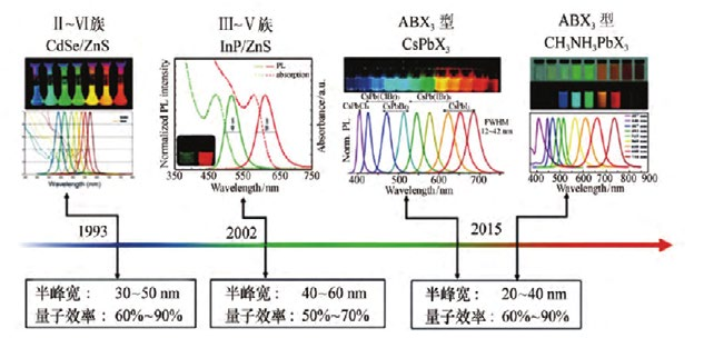 量子点显示是利用发光量子点材料的一种显示技术,,,,改变量子点尺寸就能实现色彩的调控,,具有高亮度、、、、较大色域、、高对比度、、、、低功耗的优点。。。根据发光形式的不同,,量子点显示可分为光致发光和电致发光。。光致发光量子点显示可与现有液晶电视工艺结合提高画质,,电致发光量子点显示可实现自主发光显示,,,但是较为成熟的技术路线基于含镉量子点材料,,有毒性,,欧盟等国家已禁止销售,,,应着力探索无毒电致发光 QLED显示在中小尺寸、、短使用期等市场应用。。。图4为量子点显示材料种类。。