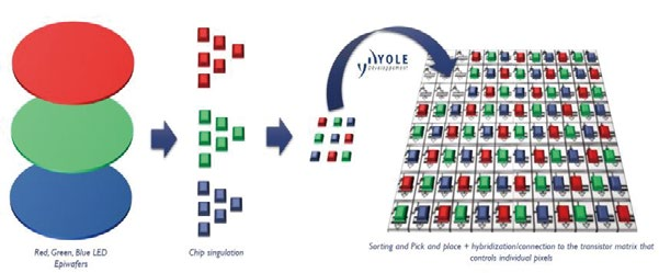 Mini/Micro-LED 显示是由微米级半导体发光像元阵列组成的新型显示技术,,将 LED 器件微小化(<100 %u3BCm)、、薄膜化、、、、阵列化后,,,,批量转移至电路基板上形成的显示器件,,,具有高亮度、、超高分辨率与色彩饱和、、发光效率高的特点,,,不易受水汽、、、氧气或高温的影响,,,稳定性、、使用寿命、、、、工作温度较好。。。图5为 Micro-LED 工艺流程。。。